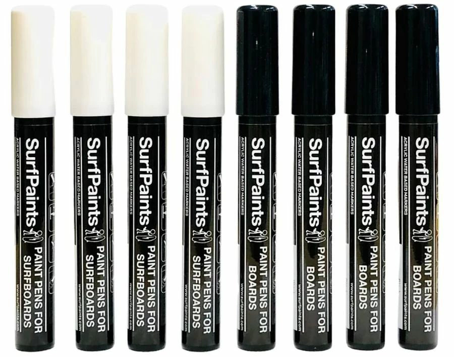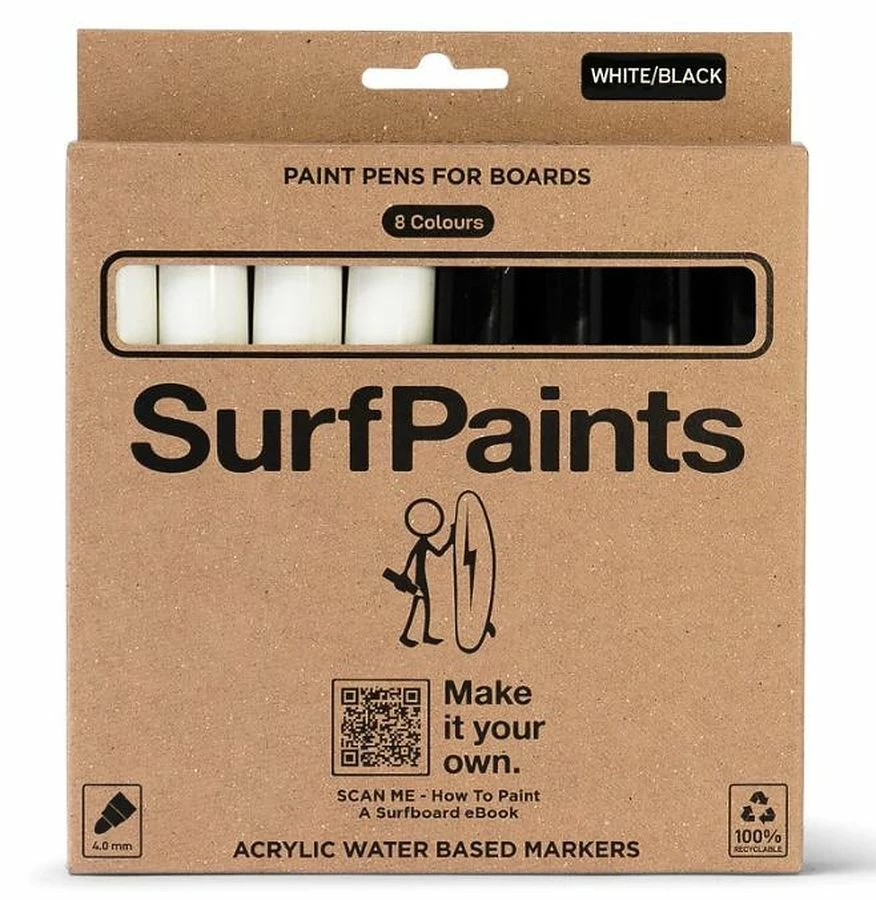 Surfpaints acrylic, water-based, non-toxic and fade resistant paint pens are designed to have the best adhesion to Fiberglass and Foamy slick surfboards. The paint pens are bullet shaped and 4mm in diameter. Surfpaints are travel safe and works on over 12 different surfaces including fins and skateboards.